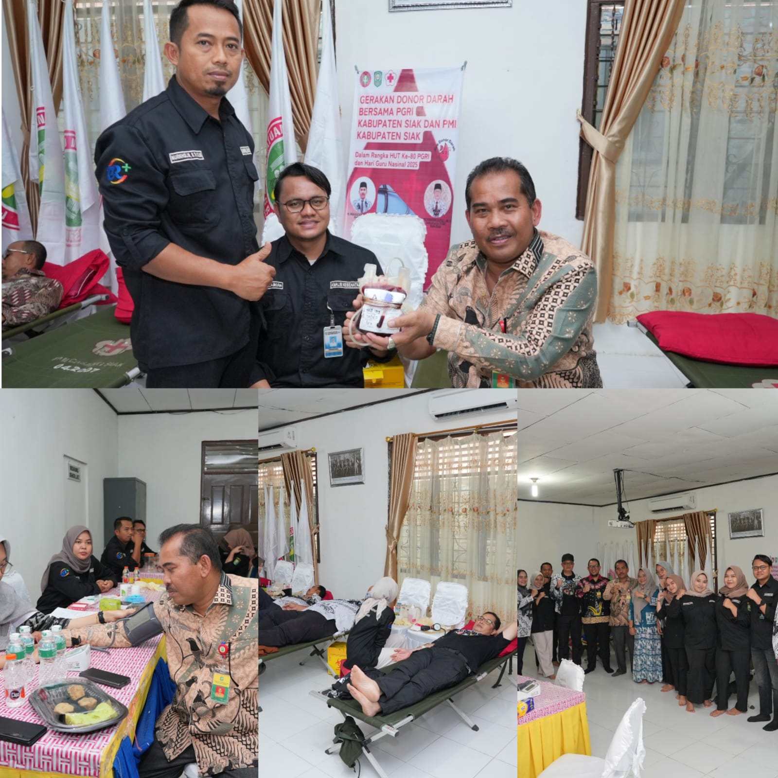 SIAK, Kupasfakta.com — Dalam rangka memperingati HUT PGRI ke-80 dan Hari Guru Nasional 2025, Persatuan Guru Republik Indonesia (PGRI) Kabupaten Siak menggelar kegiatan donor darah yang diikuti para guru dari berbagai kecamatan. Sebanyak 43 guru hadir dan 36 kantong darah berhasil dikumpulkan dalam kegiatan sosial tersebut.