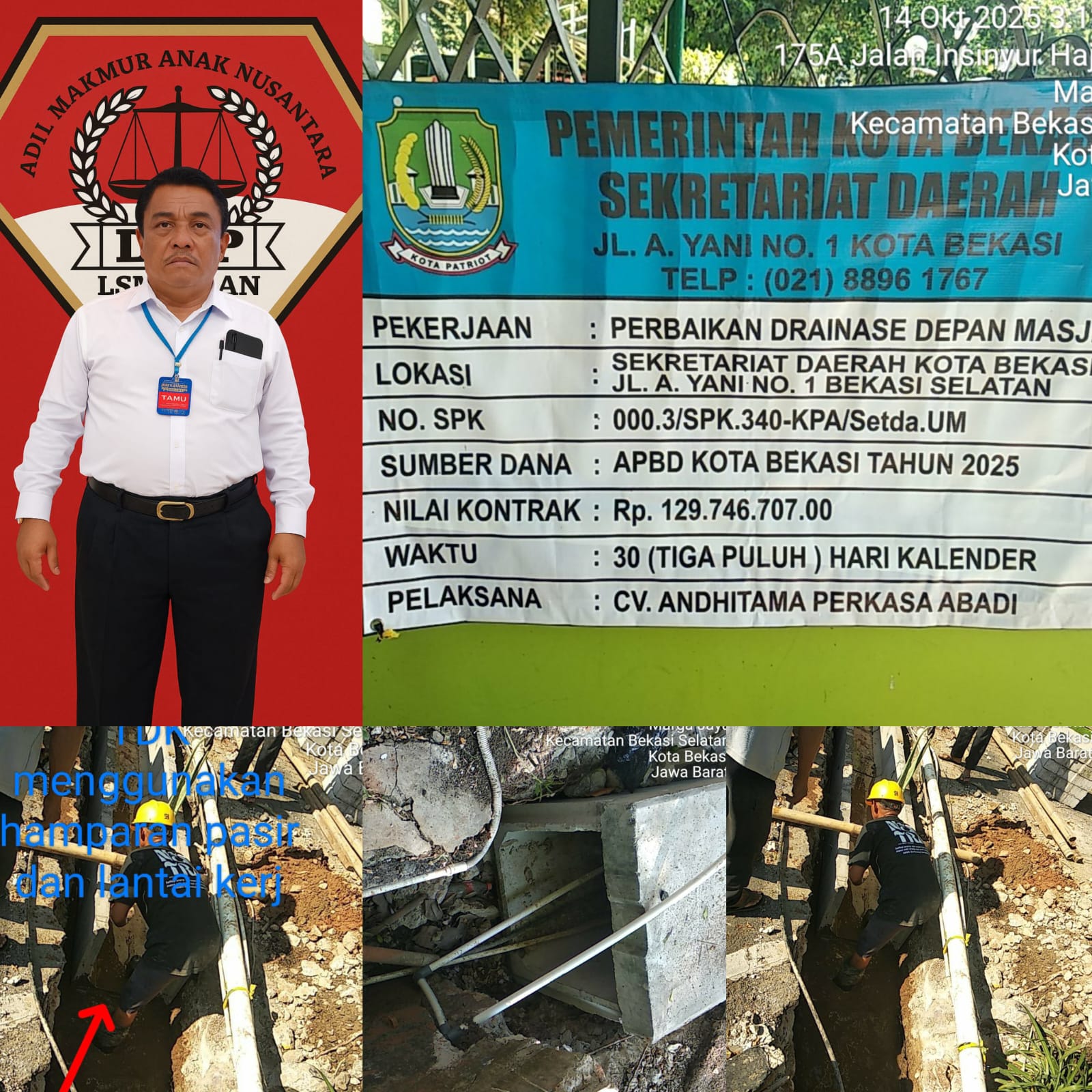 Bekasi. Kupasfakta.com—Niat baik Pemerintah Kota Bekasi dalam meningkatkan pelayanan publik dan memperkuat infrastruktur justru dinodai oleh dugaan praktik kerja asal-asalan pada proyek Perbaikan Drainase Depan Masjid dan Gorong-gorong Kantor Wali Kota Bekasi. Proyek yang diselenggarakan oleh Satuan Kerja Sekretariat Daerah Kota Bekasi itu kini menuai sorotan tajam dari LSM Aman.