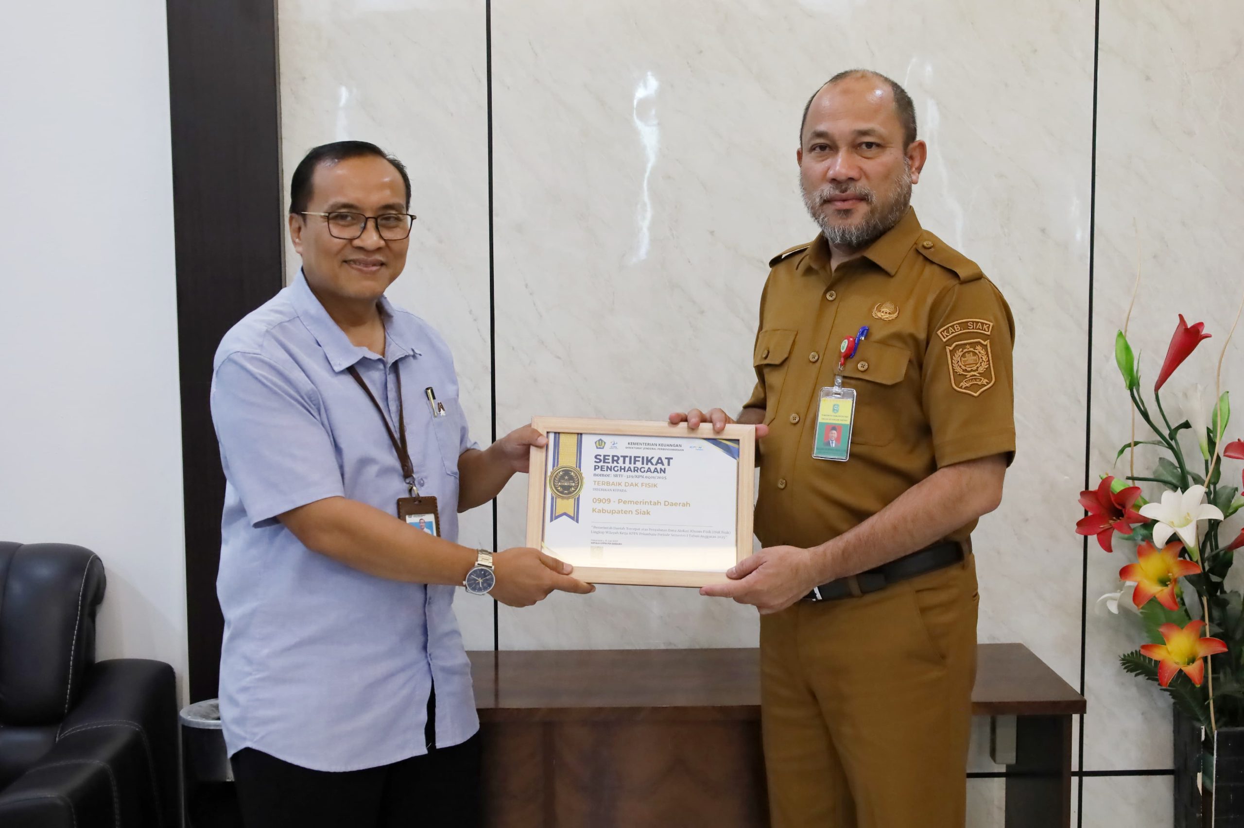 Piagam penghargaan diserahkan Kepala KPPN Pekanbaru, Tri Widiyono, kepada Kepala Badan Keuangan Daerah (BKD) Kabupaten Siak, Raja Indor. Penyerahan berlangsung di ruang kerja Kantor BKD Siak, Kompleks Kantor Bupati Tanjung, Selasa (14/10/2025).